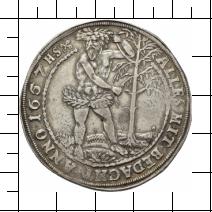 ALLES. MIT. BEDACHT. ANNO 1657. Wilder Mann mit Baum in den Händen, in felsiger Landschaft. Links oben H S und Münzmeisterzeichen des Henning Schlüter.