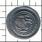 + IPNHC LEOEL DVX HINPICS O LSO A [teilweise spiegelverkehrt]. Löwe nach links schreitend, Kopf dem Betrachter zugewandt. Der Schwanz endet in einer halben Palmette.