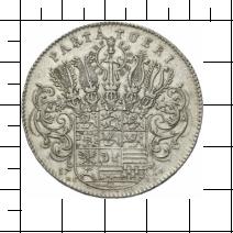 PARTA TUERI. Vierzehnfeldiger Wappenschild, darüber fünf Helme. Strichelrand. Unten 17-14 und Münzmeisterzeichen des Heinrich Christoph Hille.