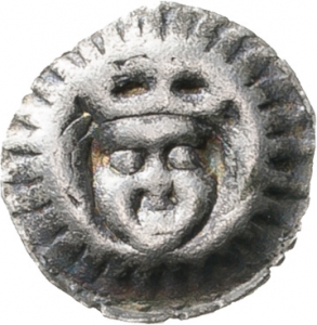 Vorderseite: Gekrönter Kopf mit Seitenlocken. Strichelrand.