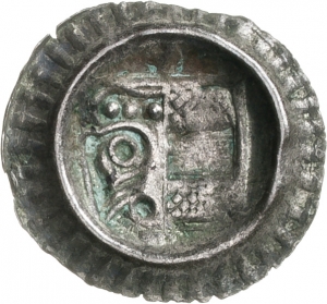 Vorderseite: Im gotischen Dreieckschild Stadtwappen mit Stierkopf. Strahlenrand.