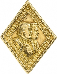 Rautenförmige gegossene Goldmedaille.