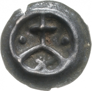Vorderseite: Lateinisches Kreuz auf einem Bogen. Im Bogen Stern. Links und rechts im Feld Kugel.