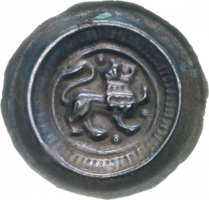 Vorderseite: Löwe nach rechts schreitend. Drei Kugeln über das Feld verteilt. Wulstkreis und Gitterkreis.