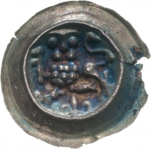 Vorderseite: Gekrönter? Löwe, Kopf dem Betrachter zugewandt, nach links über Lilie springend.