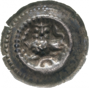 Obverse: Gekrönter Löwe, Kopf dem Betrachter zugewandt, nach links springend, darunter Halbbogen mit Punkt. Doppelter Perlkreis.