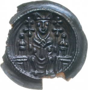 Obverse: Bischof mit zwei doppelten Kugelkreuzstäben zwischen zwei Podesten mit Kuppeltürmen sitzend.