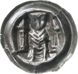 Obverse: Sitzender Bischof, beiderseits Turm mit spitzem Dach.