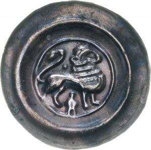 Obverse: Löwe nach rechts stehend über Kuppelturm. Zwischen Schwanz und Kopf Kugel.