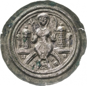 Vorderseite: Verschleierte Äbtissin mit Lilie in der Rechten und Palmzweig in der Linken auf Mauerleiste sitzend. Links und rechts dreistöckiger Kuppelturm mit Seitengebäuden. Die Mauerleiste wird gestützt von Rundbogen. Die Füße der Äbtissin stehen auf einem kleinen Rundbogen. Links und rechts unten Pfeilspitzenkreuz.