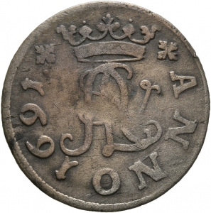Obverse: ANNO 1691. Die miteinander verschlungenen Initialen RAV von Rudolph August und Anton Ulrich unter einer Krone.