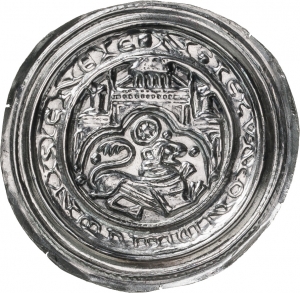Vorderseite: + NSICLVNONIDOVONISICNEIC [Trugschrift]. Löwe nach rechts unter dreiteiligem Bogen liegend, darüber Burg mit Mittelturm und zwei Seitentürmen. Über dem Löwen Rad mit sechs Speichen.