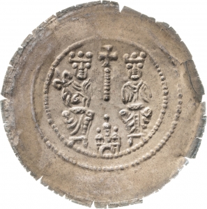 Vorderseite: Thronendes Königspaar, die linke Person mit Lilienzepter in der Rechten, dazwischen Kreuzstab. Unten dreitürmiges Gebäude mit Tor. Zwei Perlkreise.