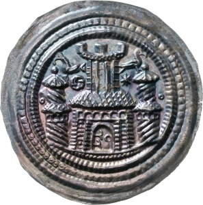 Vorderseite: In dreifachem Zierreif Torgebäude mit Wehrgang und Zinnenturm, beiderseits doppelstöckige Türme, auf denen ein Vogel sitzt. Im Feld Wirbelkreuz und Stern. Links und rechts Ringel.